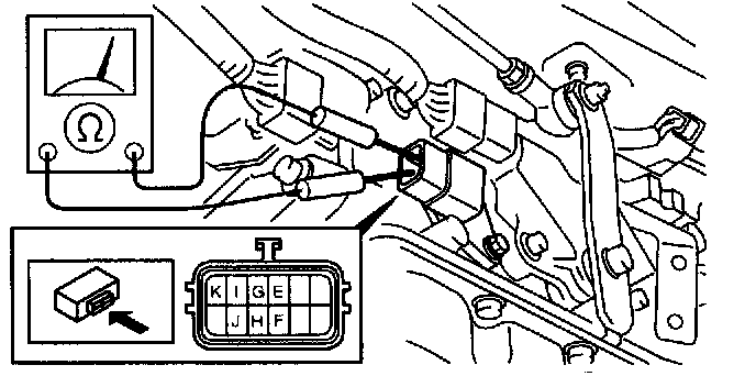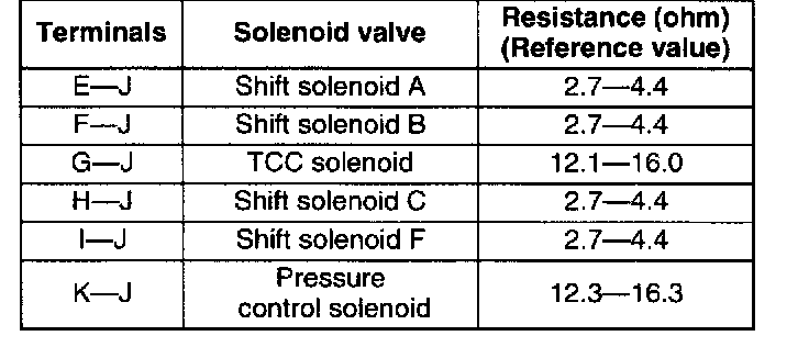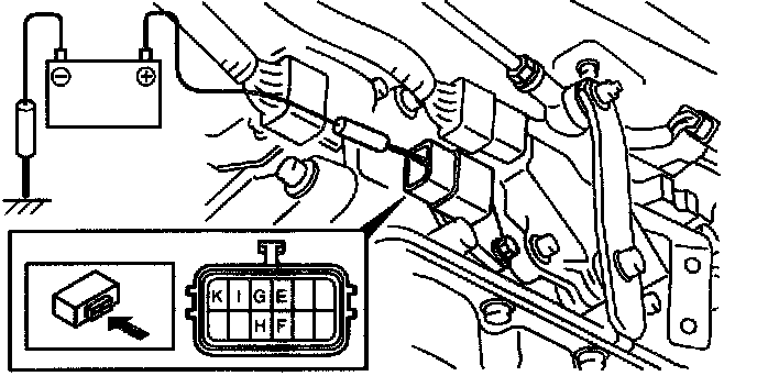 7. Apply battery positive voltage to terminals E, F, G, H, or K and battery negative voltage to GND, and verify that operation sound is heard from solenoid.