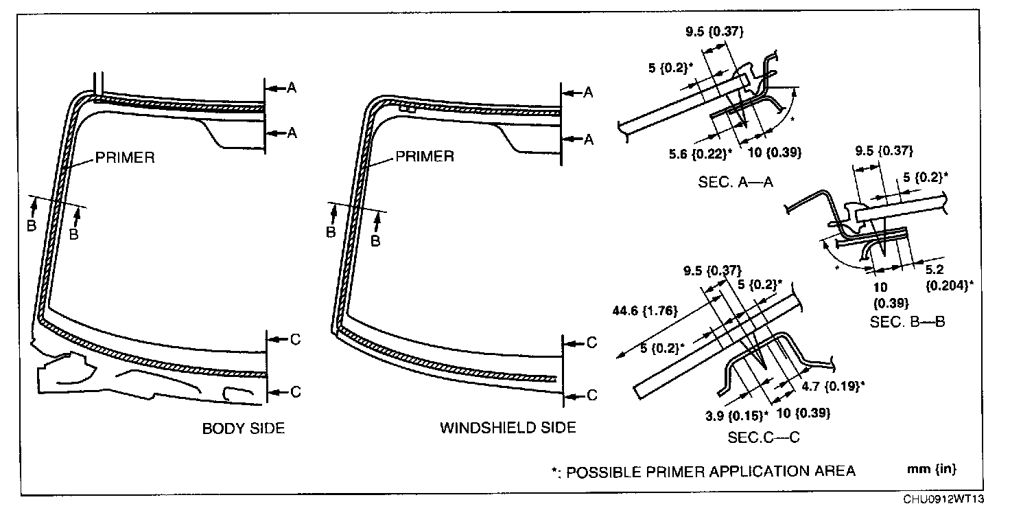 CAUTION: Keep the area free of dirt, water and grease, and do not touch the surface. Otherwise, the primer may not properly bond to the surface of the glass and body, causing leaks to occur.