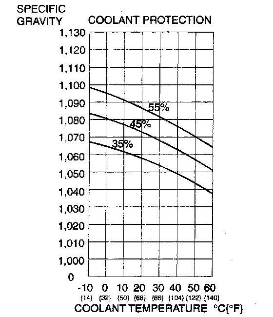 2. Determine the coolant protection by referring to the graph shown. If the coolant protection is not proper, add water or coolant.