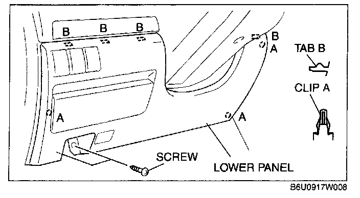 3. Pull the lower panel outward, disengage clips A and tabs B from the dashboard, and remove the lower panel.