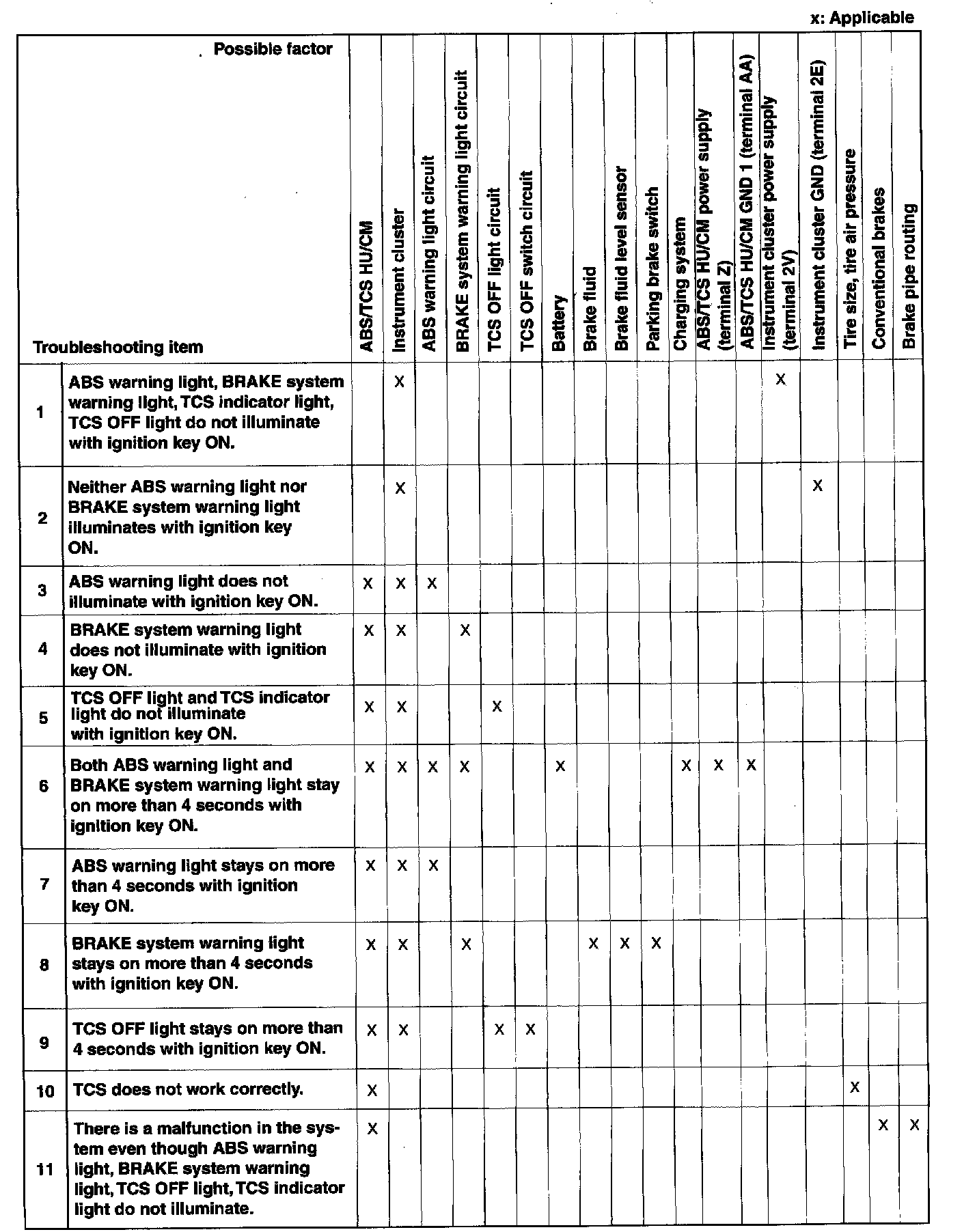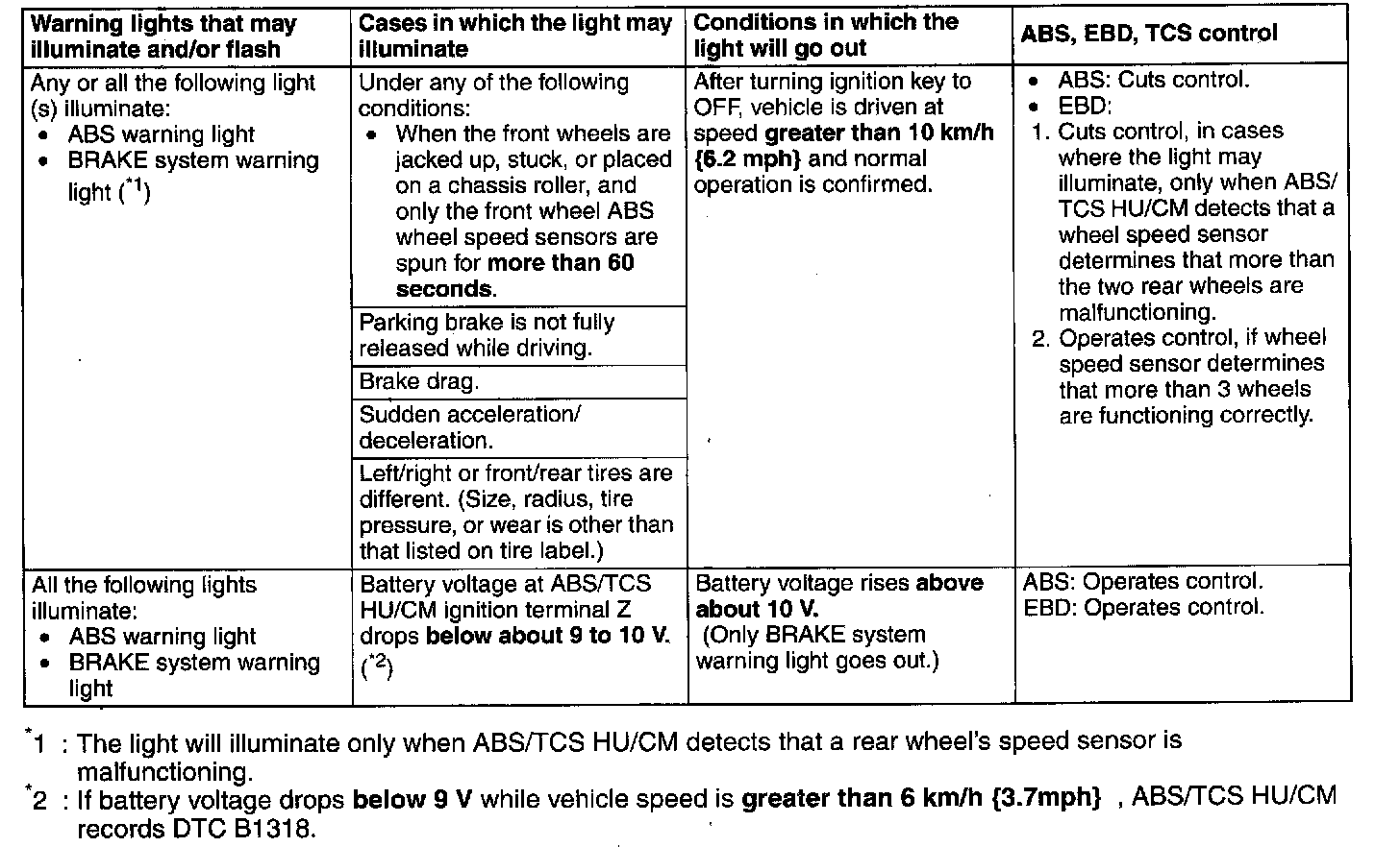 ^ If a malfunction occurred in the past but is now normal, the cause is likely a temporary poor connection of the harness. The ABS/TCS HU/CM usually operates normally. Be careful when searching for the cause of malfunction.
