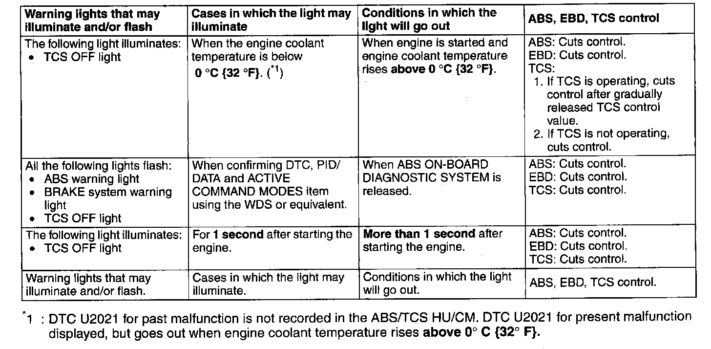 1. Any one or a combination of the ABS warning light, BRAKE system warning light, TCS indicator light, and TCS OFF light illuminate even when the system is normal.