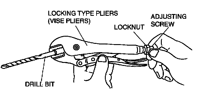 3. With the jaws of locking-type pliers (vise grips) closed and locked, turn the adjusting screw to position the jaws against the drill bit with the diameter measured (height) in the removal procedure 1. Tighten the lock nut on the adjusting screw against the handle to lock the adjustment in place.