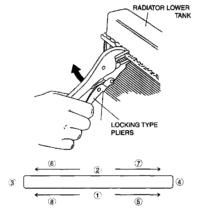 4. Squeeze the header tabs down in the order as shown against the lip of the radiator outer tank base with the locking-type pliers while rotating the pliers toward the tank.