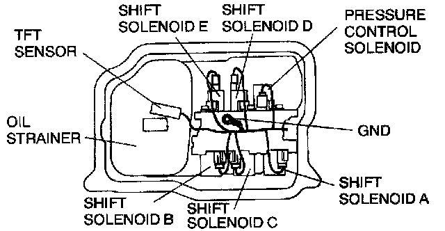 7. Disconnect the solenoid connectors and GND, and remove the TFT sensor.