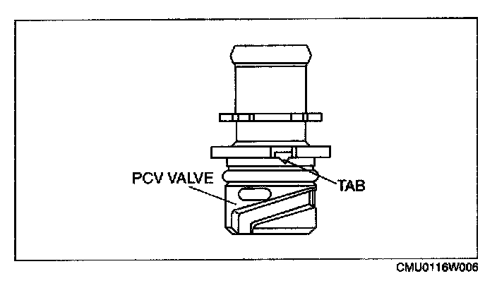 POSITIVE CRANKCASE VENTILATION (PCV) VALVE INSPECTIONNOTE: Removing the PCV valve might damage to the tab of the PCV valve and it will not be able to be reinstalled. Due to this, inspect the PCV valve with it installed on the vehicle.