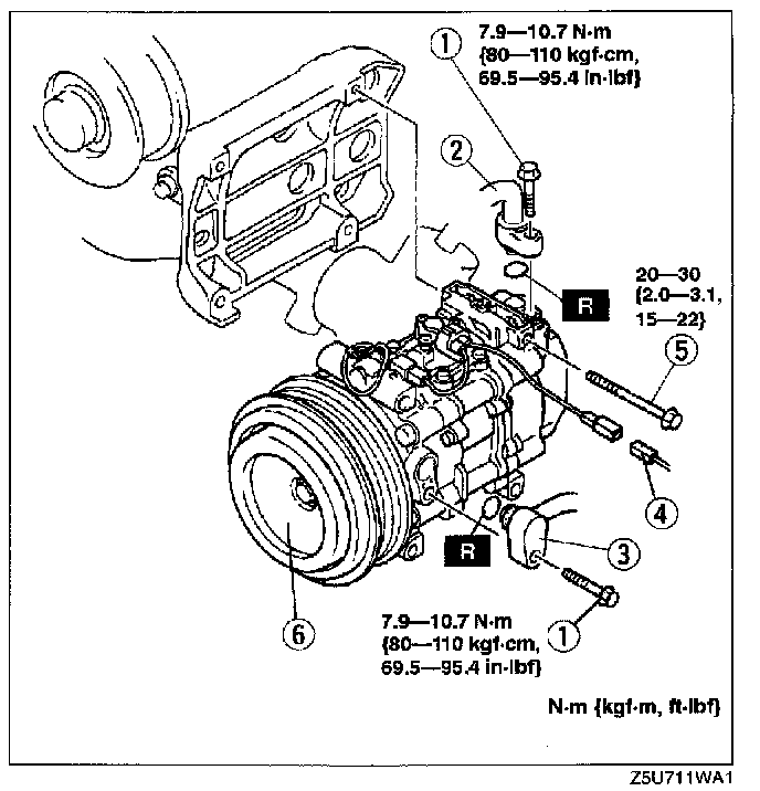 A/C COMPRESSOR REMOVAL/INSTALLATION1. Discharge the refrigerant from the system. (See REFRIGERANT CHARGING.)