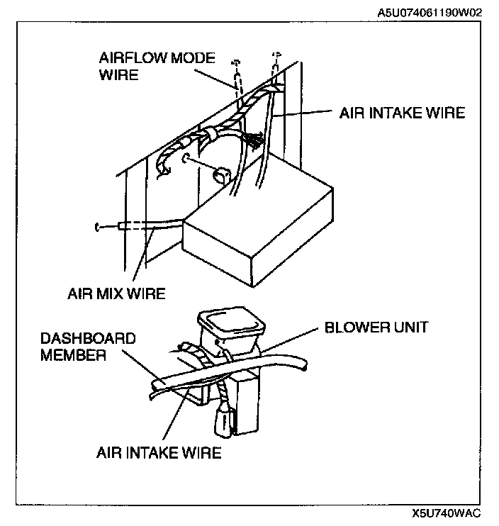 5. Adjust the climate control unit wire. (See CLIMATE CONTROL UNIT WIRE ADJUSTMENT.)