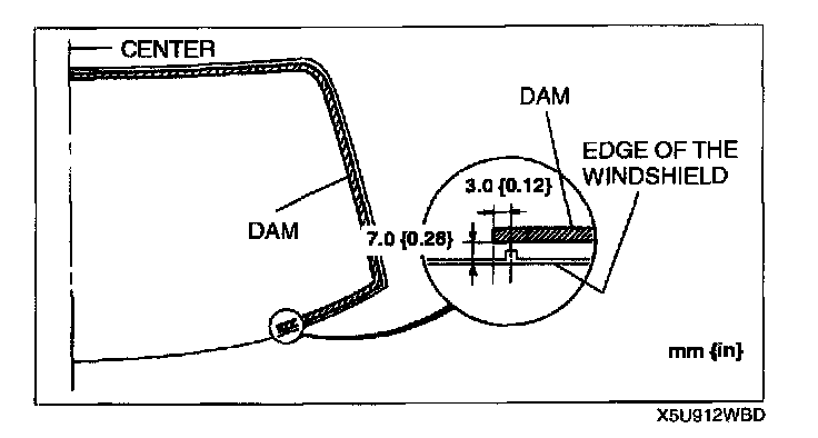 11. Once the primer is dry, apply sealant around the entire circumference to fill the gap between the dam and the edge of the glass measuring 11.0 mm {0.43 in} high and 5.0 mm {0.20 in} wide.