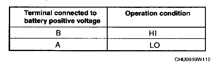 2. Connect battery positive voltage to windshield wiper motor terminal A or B, and ground to terminal D, then verify that the windshield wipers operate as shown in the table.