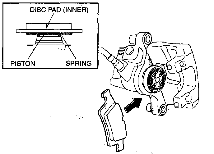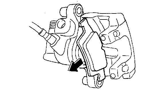 2. Pull the disc pad (inner side) in the direction of the arrow to remove it from the caliper as shown in the figure.