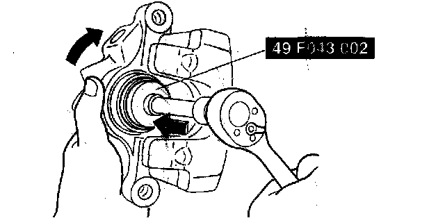 3. Slowly rotate the piston clockwise while firmly pushing it to the caliper body using the SST and push the piston completely into the caliper body.