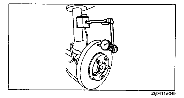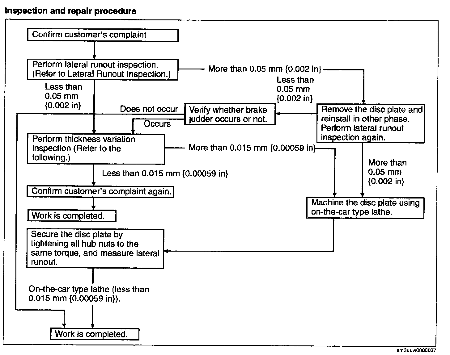 1. If the runout is more than 0.05 mm (0.002 in) at the position 10 mm (0.39 in) from the disc plate edge, uneven wear occurs on the disc plate because the pad contacts the plate unevenly
