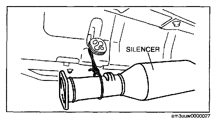 3. Disconnect the hanger rubber except for the one installed to the rear end of the vehicle from the silencer, and suspend the silencer using rope.