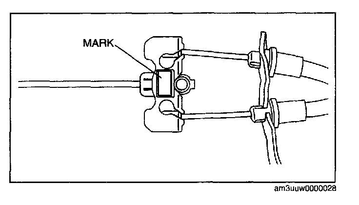 1. Install the front parking brake cable with the mark on the equalizer facing toward the vehicle downside.