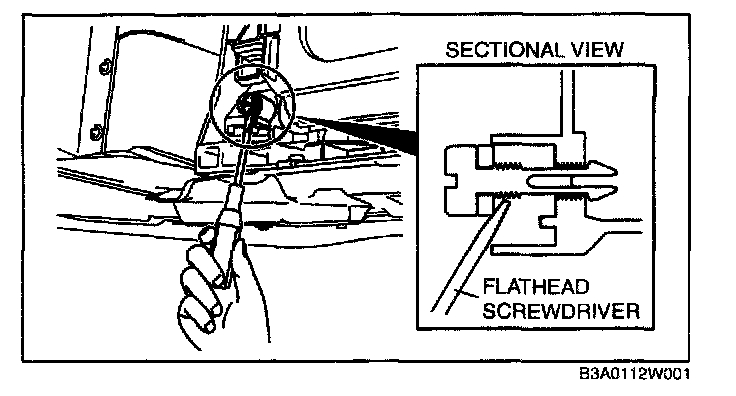 Caution: Do not apply excessive force to the flathead screwdriver or equivalent as doing so can damage the drain bore. Slowly and carefully pry out the radiator drain plug when removing it.