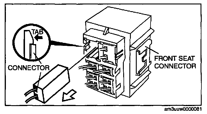 1. Detach the tab as shown in the figure and remove the connector from the front seat connector.