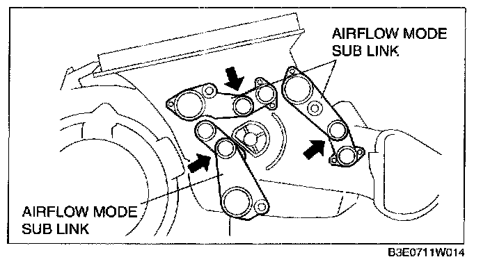 3. Press the airflow mode main link lightly to the A/C unit it in the direction shown by the arrow, then set the projections of each airflow mode sub link into the grooves of the airflow mode main link.