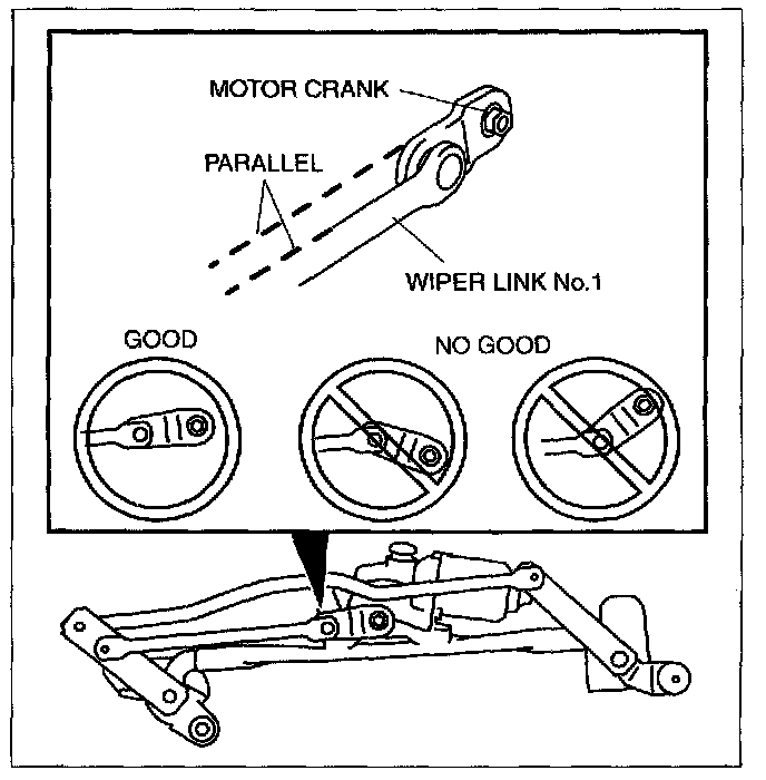 2. Adjust the motor crank, wiper link No. 1, and wiper link No.2 so that they are parallel as shown in the figure.