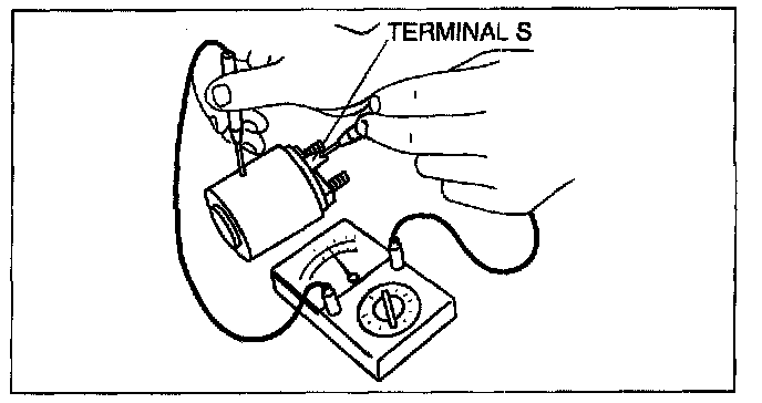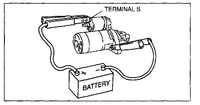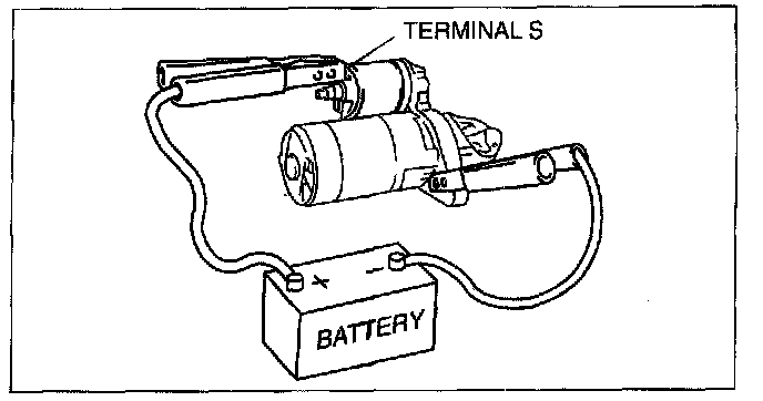 1. Verify that the starter motor pinion is extended while battery positive voltage is connected to terminal S and the starter body is grounded.