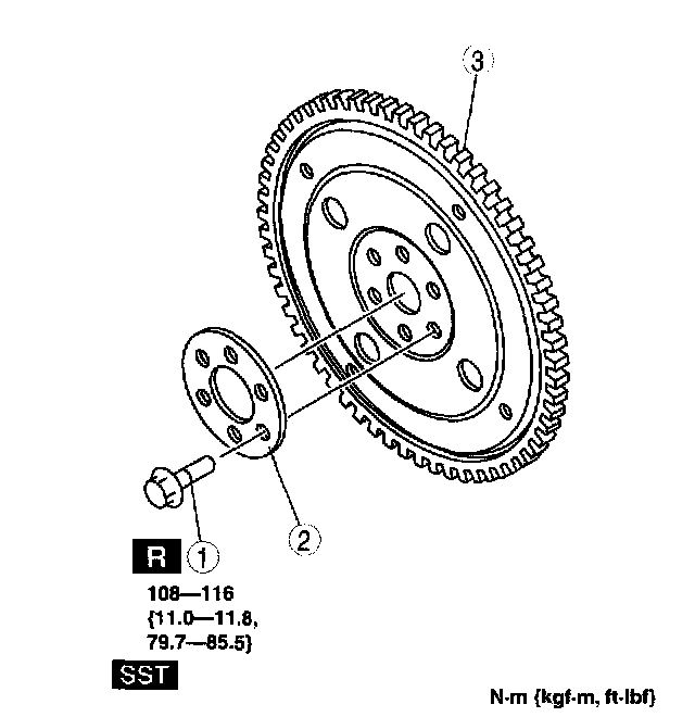 Tightening torque 108 - 116 Nm (11.0 - 11.8 kegs-cm, 79.7 - 85.5 ft. lbs.)