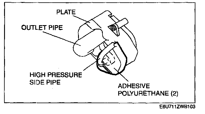 2. After assembling the outlet pipe as shown in the figure, attach the adhesive polyurethane (2) so that it adheres around the high-pressure side of the outlet pipe.