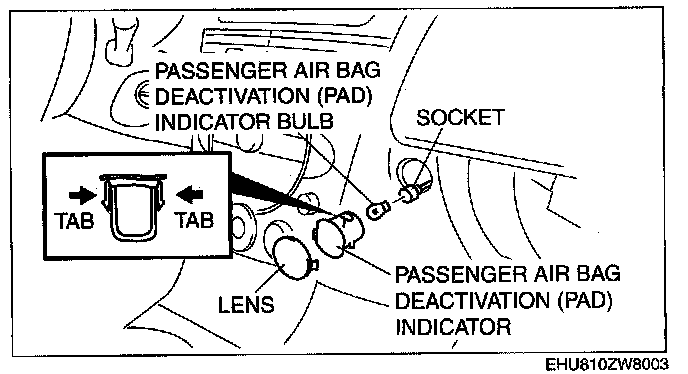3. Squeeze the tabs of passenger air bag deactivation (PAD) indicator and pull it outward to remove it.