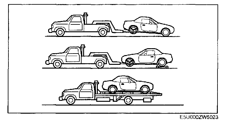 CAUTION: Do not tow the vehicle pointed forward with driving wheels on the ground. This may cause internal damage to the transmission.