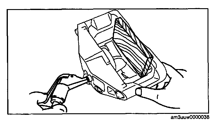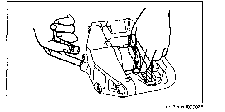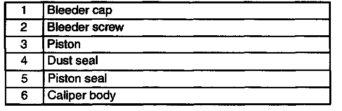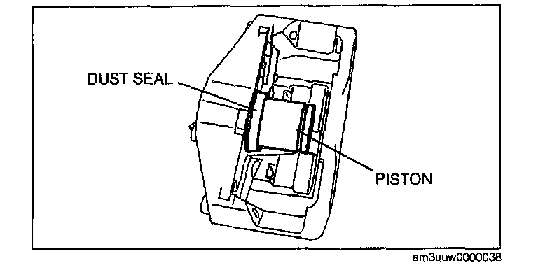 Warning: When compressed air is blown into the caliper body, injury to a finger or other part from pinching could result from the piston springing up. When blowing in compressed air, do not place your fingers between the piston and caliper body when performing the work.
