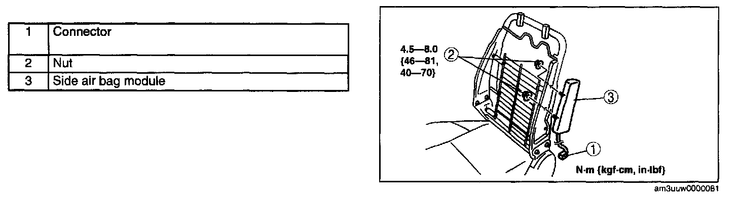 - If the side air bag module is installed with debris in the seat back, the foreign material may be scattered when the side air bag module operates (deploys), causing injury. Verify that there is no foreign material in the seat back before installing the side air bag module.