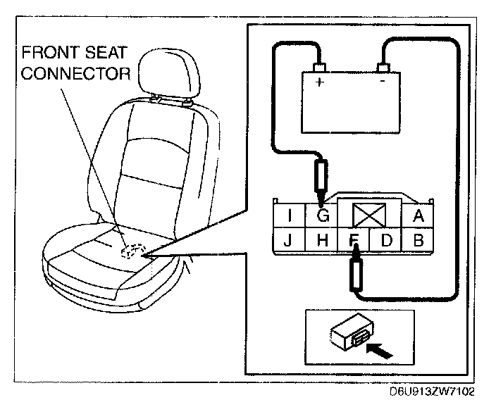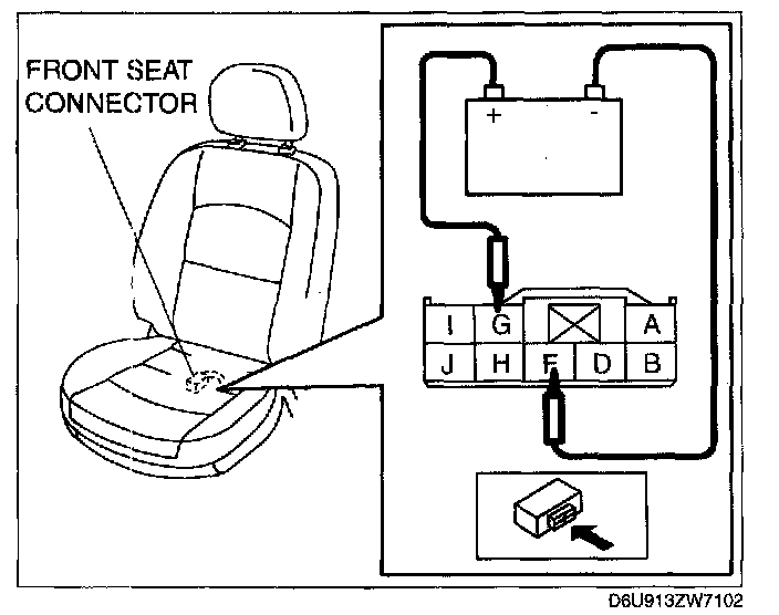 1. Connect battery positive voltage to front seat connector terminal G and connect terminal F to ground.