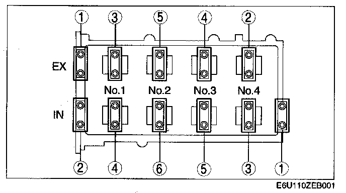 3. Install the camshaft caps and temporarily tighten the camshaft cap bolts evenly in two or three passes, and then tighten the camshaft cap bolts using the following two steps, in the order shown in the figure.