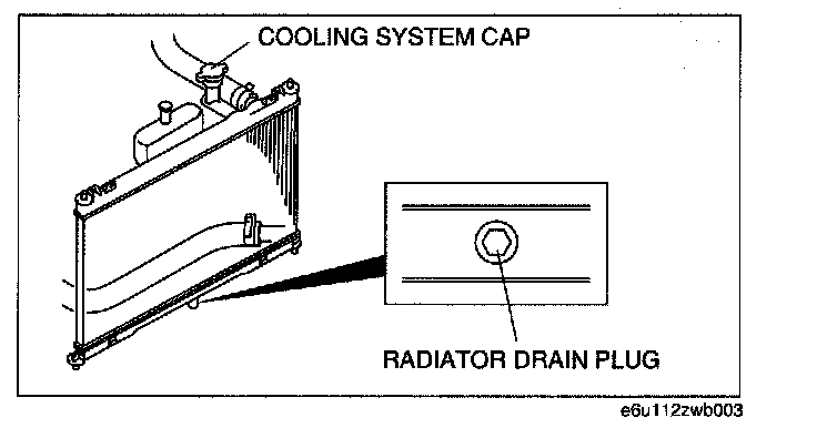 ^ Never remove the cooling system cap or loosen the radiator drain plug while the engine is running, or when the engine and radiator are hot. Scalding engine coolant and steam may shoot out and cause serious injury. It may also damage the engine and cooling system.