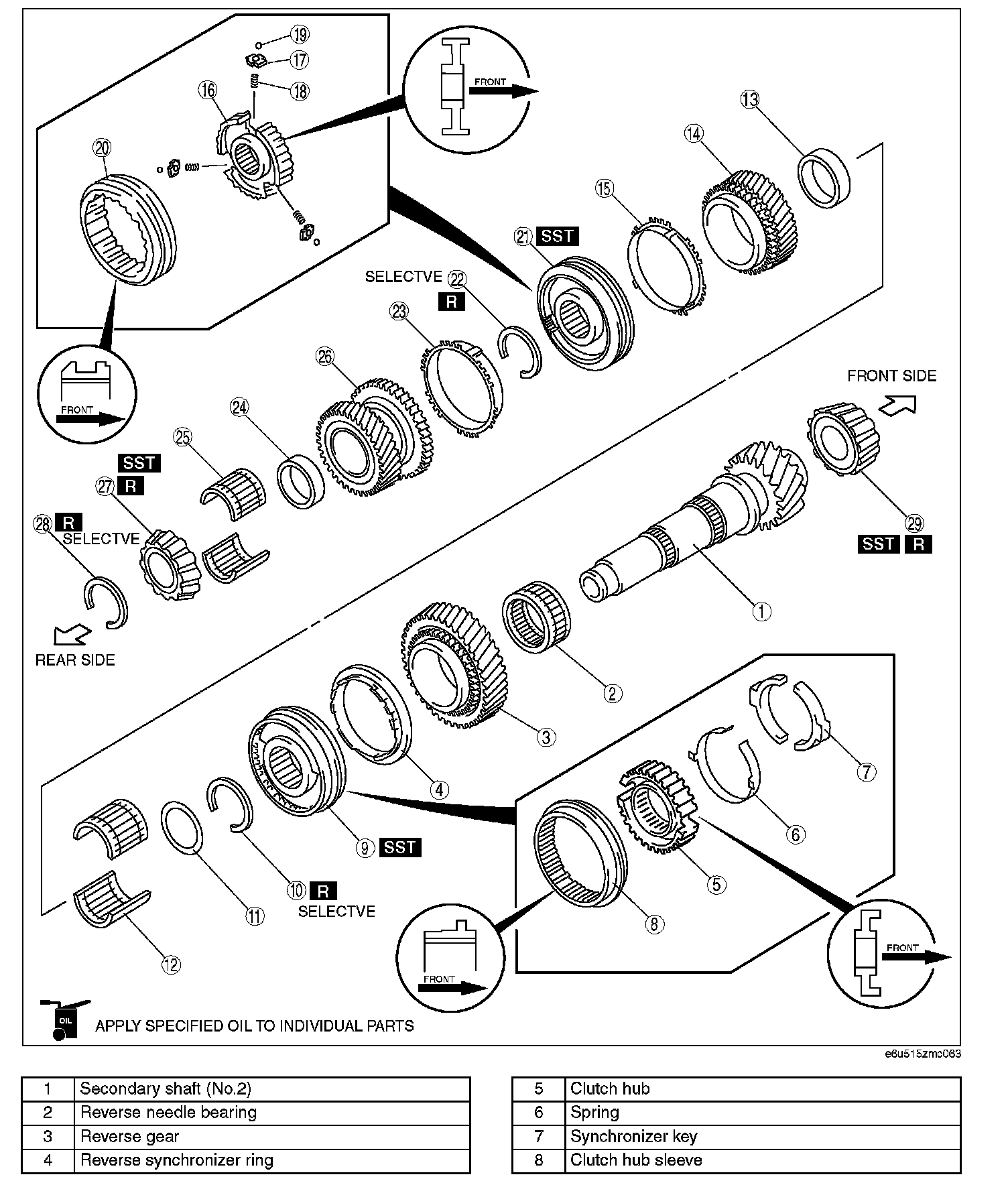 SECONDARY SHAFT (NO.2) COMPONENTS ASSEMBLYCaution: Do not place the front bearing facing downward on a workbench after assembling the secondary shaft (NO.2) component. It may cause damage to the bearing roller guide.
