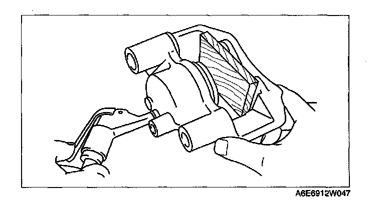 1. Insert a piece of wood in the caliper as shown in the figure, and then blow compressed air through the bleeder screw hole to remove the piston from the caliper body.
