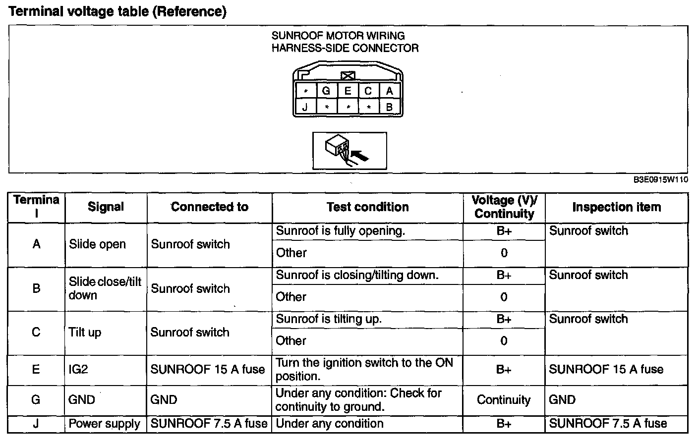 SUNROOF MOTOR INSPECTION1. Measure the voltage at each terminal (other than terminal G).