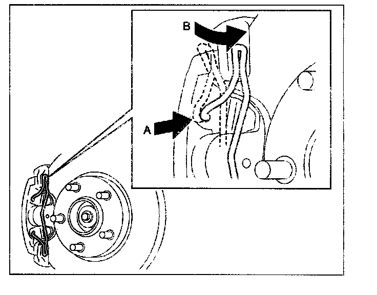 1. Temporarily install the retaining clip to the caliper and mounting support as shown in the figure.