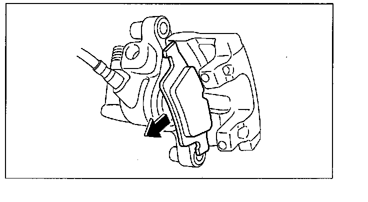 3. Pull the disc pad (inner side) in the direction of the arrow to remove it from the caliper as shown in the figure. (A type)