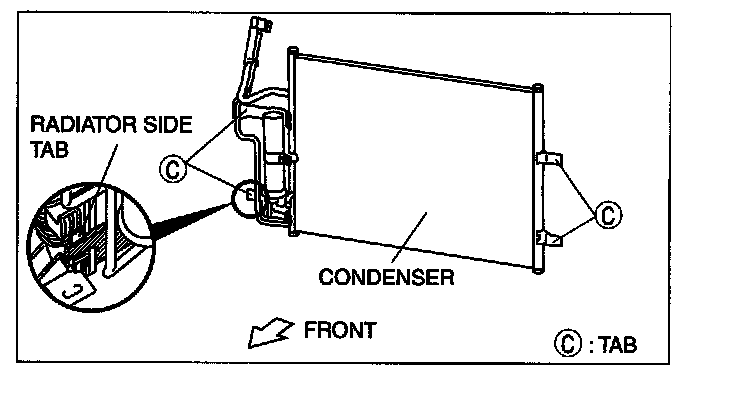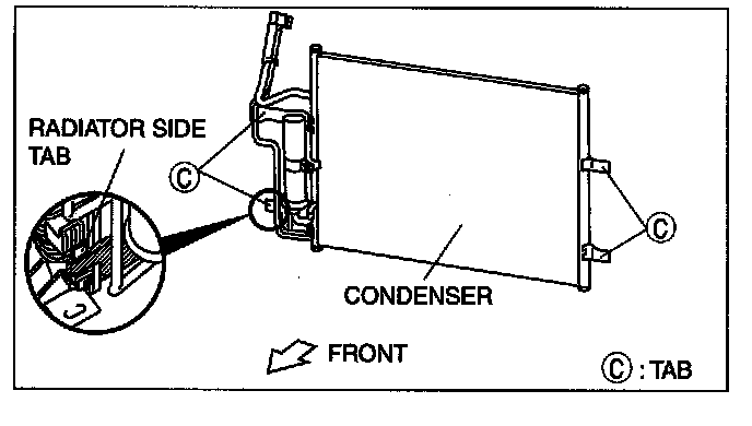 1. Install the condenser to the radiator by aligning lower side tab C with the radiator side tab, install upper tab C, then install lower side tab C.