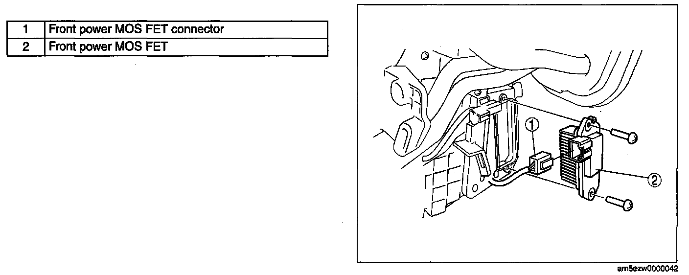 FRONT POWER METAL OXIDE SEMICONDUCTOR FIELD EFFECT TRANSISTOR (POWER MOS FET) REMOVAL/INSTALLATION [FULL-AUTO AIR CONDITIONER]1. Disconnect the negative battery cable.