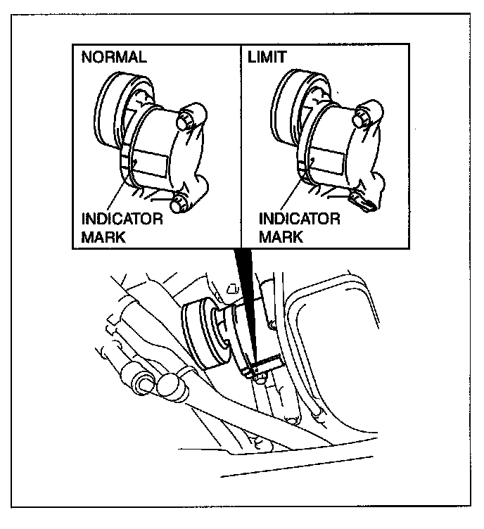 1. Verify that the drive belt auto tensioner indicator mark does not exceed the limit.