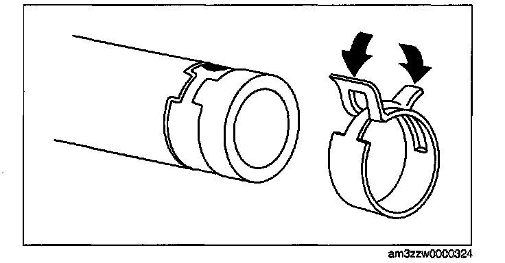 ^ If reusing the hose, install the new hose clamp exactly on the mark left by the previous hose clamp. Then apply force to the hose clamp in the direction of the arrow in order to fit the clamp in place.