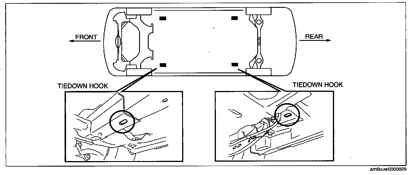 - Do not use the tie down hook for towing the vehicle. Use it only for securing the vehicle.