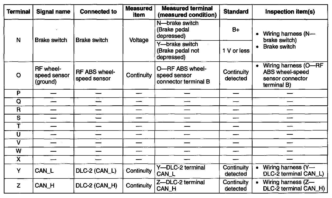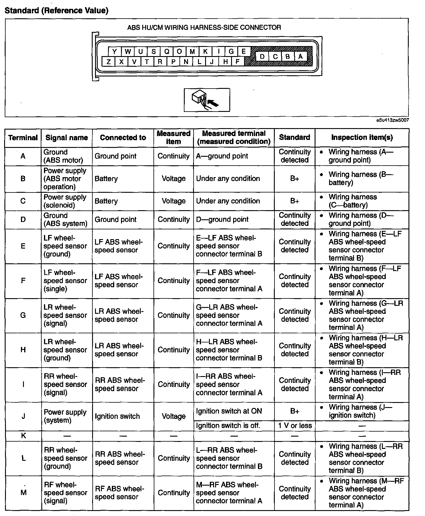 3. Attach the tester lead to the ABS HU/CM harness side connector, then inspect voltage, continuity or resistance according to the standard (reference value) on the table.