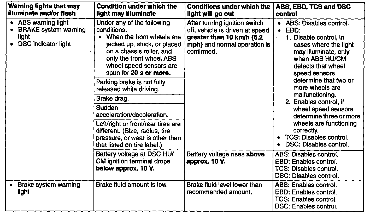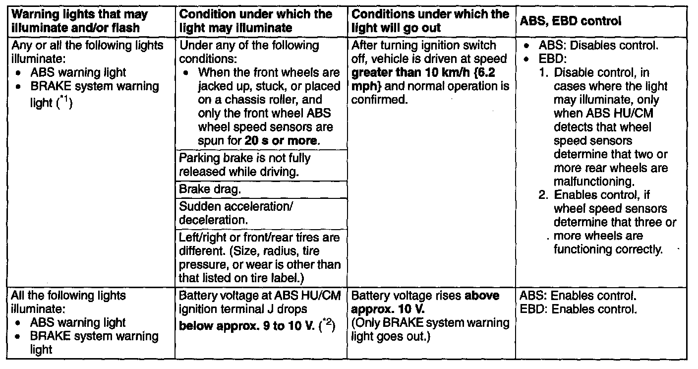1. Any one or a combination of the ABS warning and BRAKE system warning lights illuminate even when the system is normal.