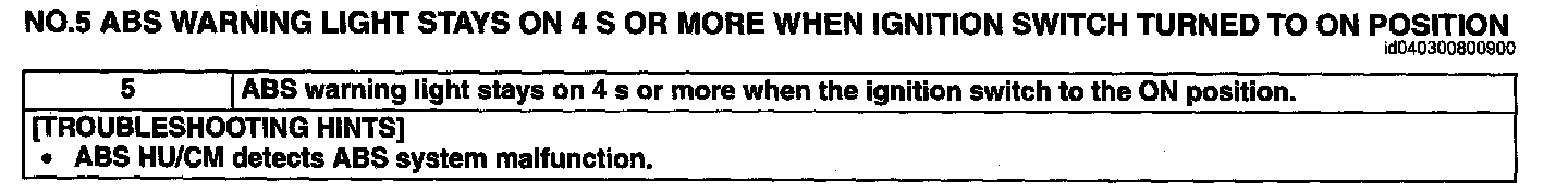 NO.5 ABS WARNING LIGHT STAYS ON 4 S OR MORE WHEN IGNITION SWITCH TURNED TO ON POSITIONNo.5 ABS Warning Light Stays on 4 S or More When Ignition Switch Turned to on Position: