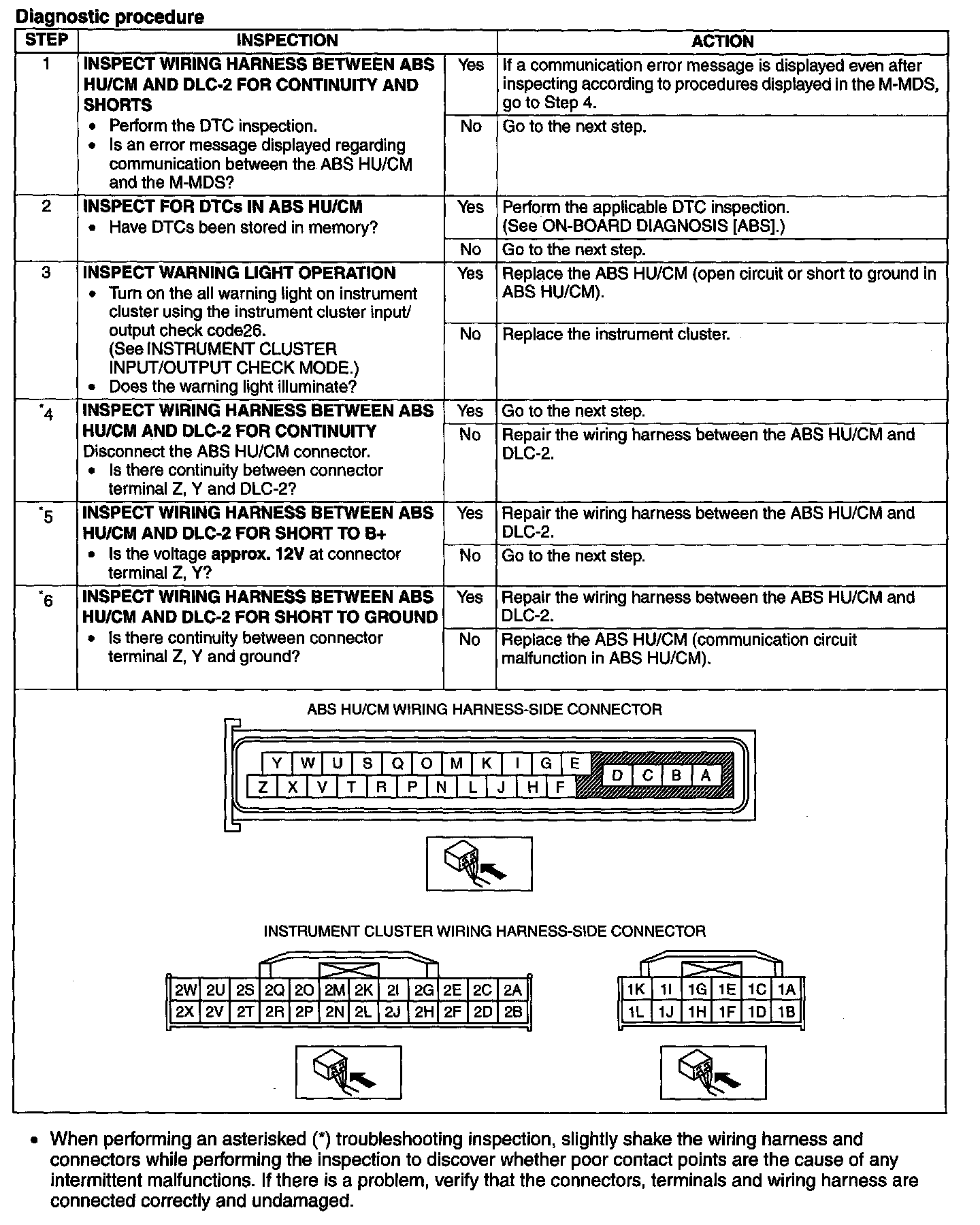 ^ When performing an asterisked (*) troubleshooting inspection, slightly shake the wiring harness and connectors while performing the inspection to discover whether poor contact points are the cause of any intermittent malfunctions. If there is a problem, verify that the connectors, terminals and wiring harness are connected correctly and undamaged.