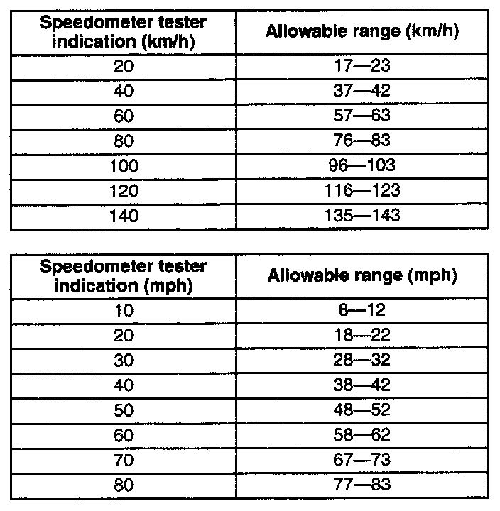 2. Using a speedometer tester, verify that the tester reading is as indicated in the table.