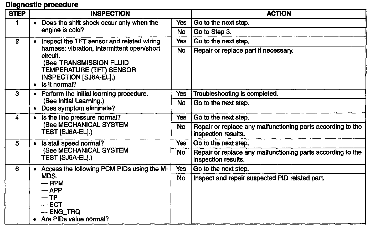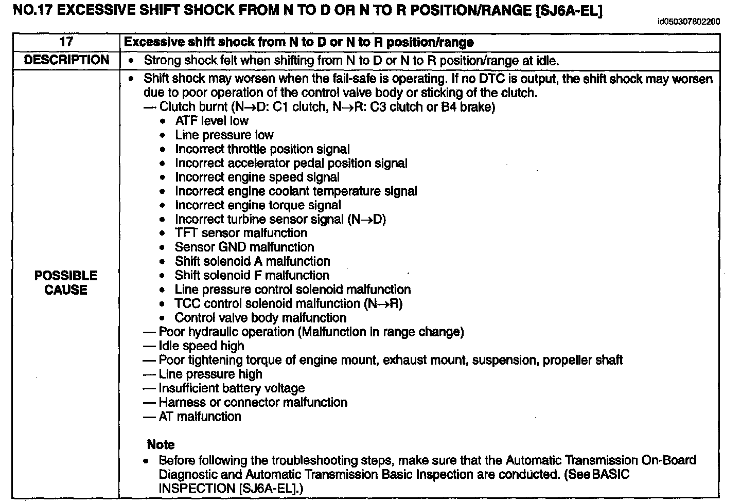 NO.17 EXCESSIVE SHIFT SHOCK FROM N TO D OR N TO R POSITION/RANGE [SJ6A-EL]No.17 Excessive Shift Shock From N to D or N to R Position/Range: