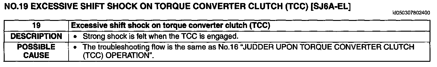 NO.19 EXCESSIVE SHIFT SHOCK ON TORQUE CONVERTER CLUTCH (TCC) [SJ6A-EL]